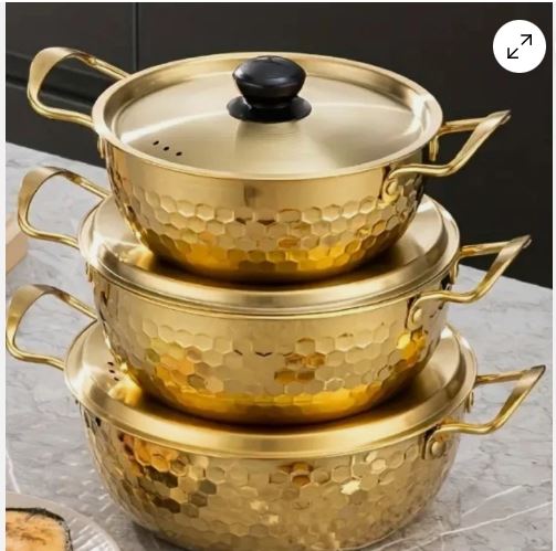 This 3-piece stainless steel Korea Ramen Pot set is a versatile and stylish addition to any kitchen. With its golden finish and hammer pattern design, it adds a touch of elegance to your cooking experience. The double handle design makes it easy to lift and carry, while the stainless steel material ensures durability and resistance to rust.