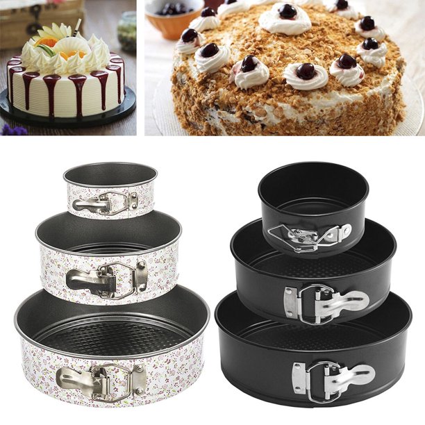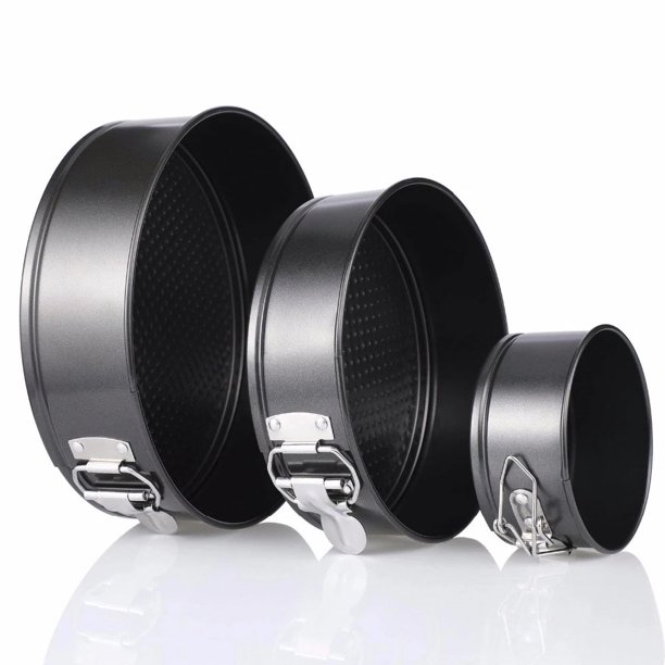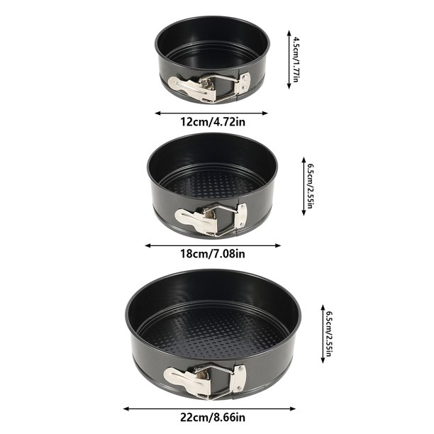 - Spring-shaped cake tins: a set of 3 (22 cm; 18 cm; 12 cm); round; no food grade BPA and PEOA; made of high-quality carbon steel and reinforced coating; 100% safe.