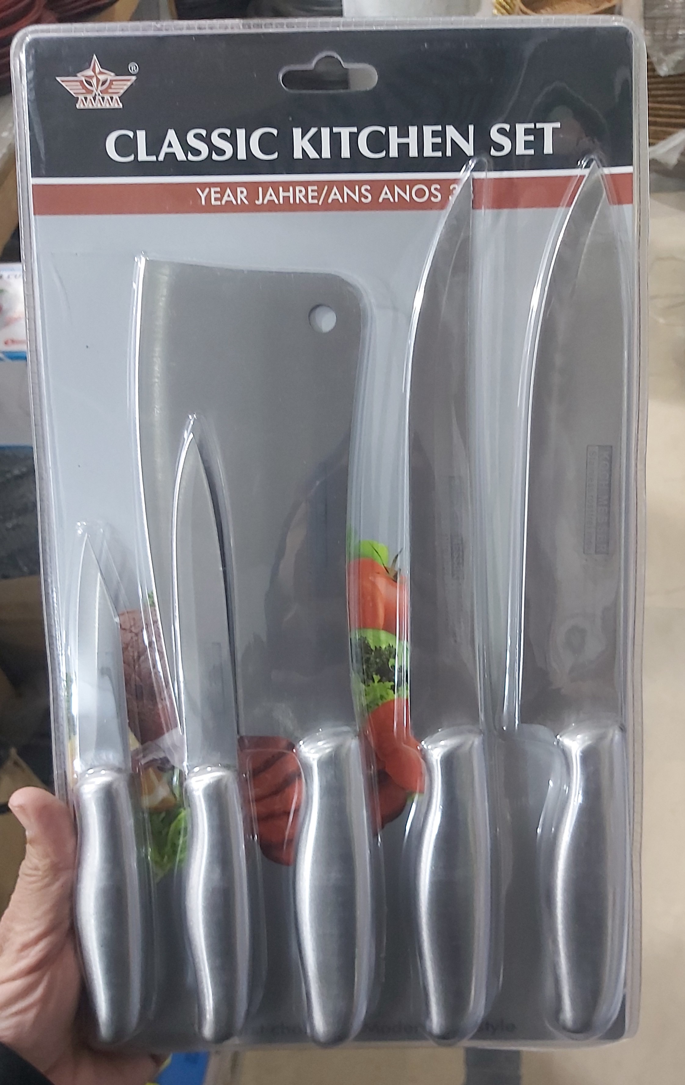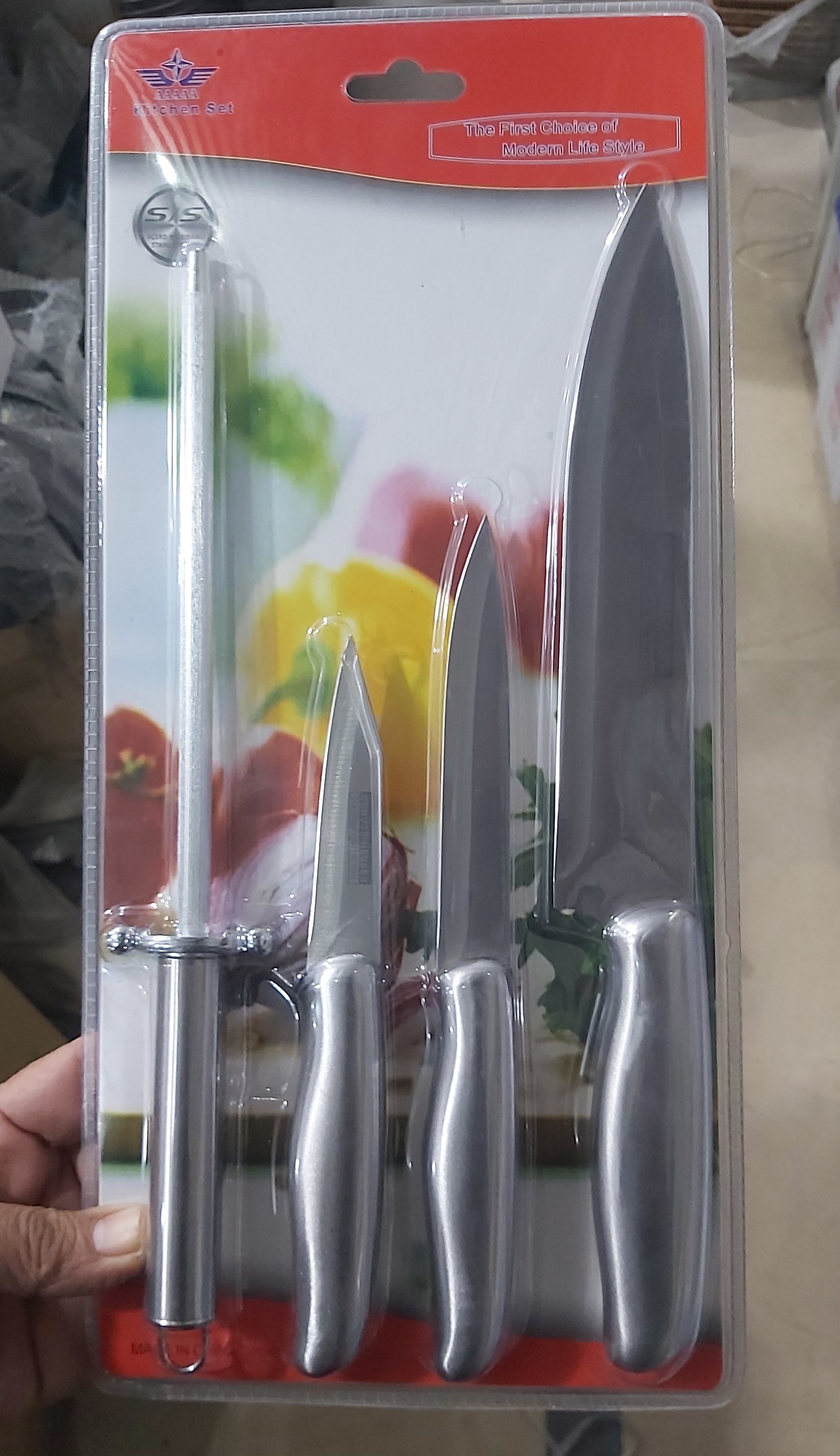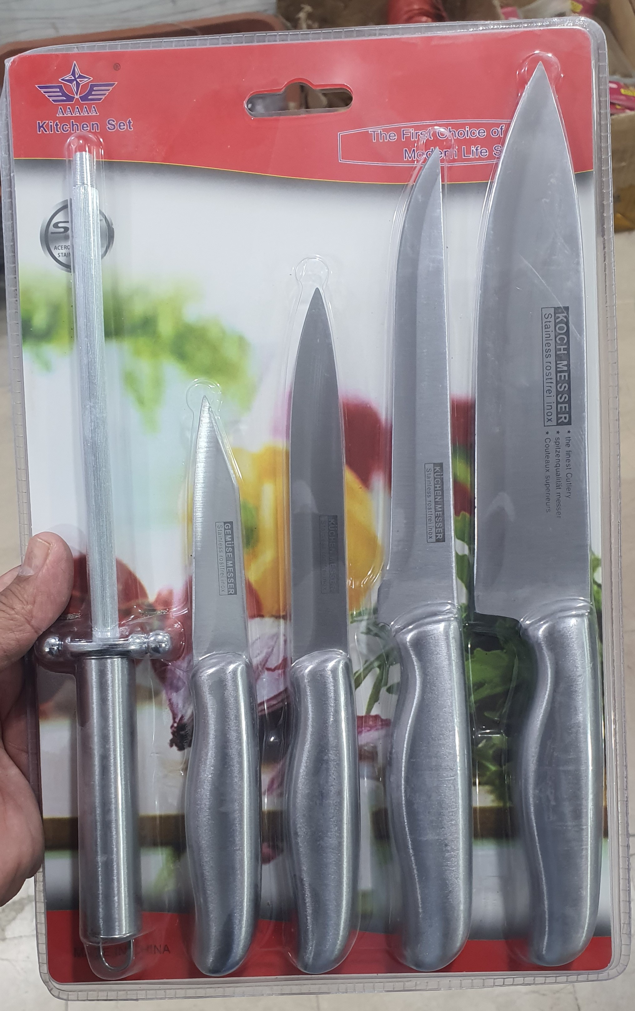 This 5-piece and 4piece Stainless Steel Knife Set is a must-have for any home cook. The set includes 5 different knives, each with a sharp blade that makes cutting and chopping a breeze. The set also comes with a sharpener to keep your knives in top condition. Made from high-quality stainless steel, these knives are durable and long-lasting. The classic design of the knives will complement any kitchen decor. Whether you're a professional chef or a home cook, this knife set is perfect for all your cooking needs.