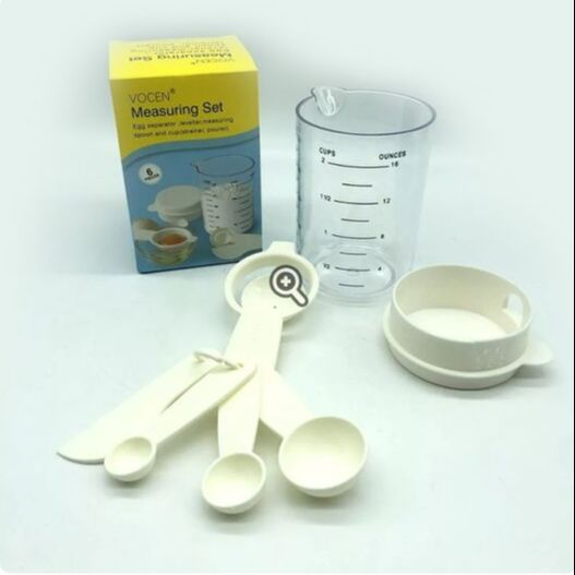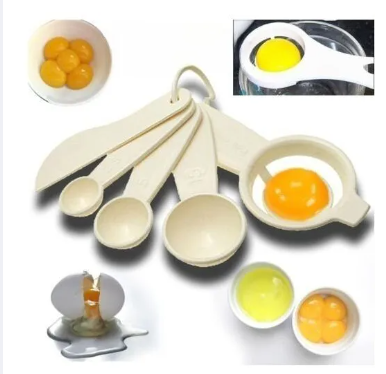 500ml jug with spout; Egg separator’ Leveller; 3spoons (1/2 tsp’ 1tsp; 1tbsp capacify) specially designed