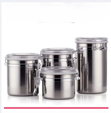 – Set of four airtight stainless steel canisters with clear lids made of durable glass